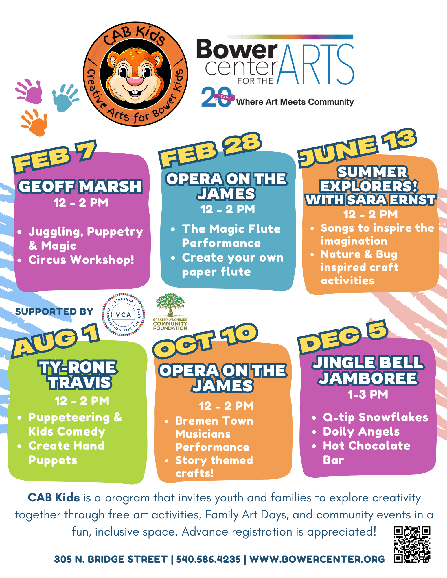 Creative Arts for Bower Kids, CAB Kids, is a program that invites youth and families to explore creativity together through free art activities, Family Art Days, and community events in a fun, inclusive space.